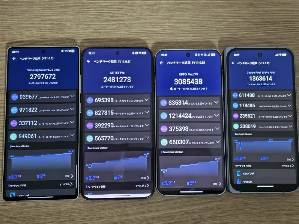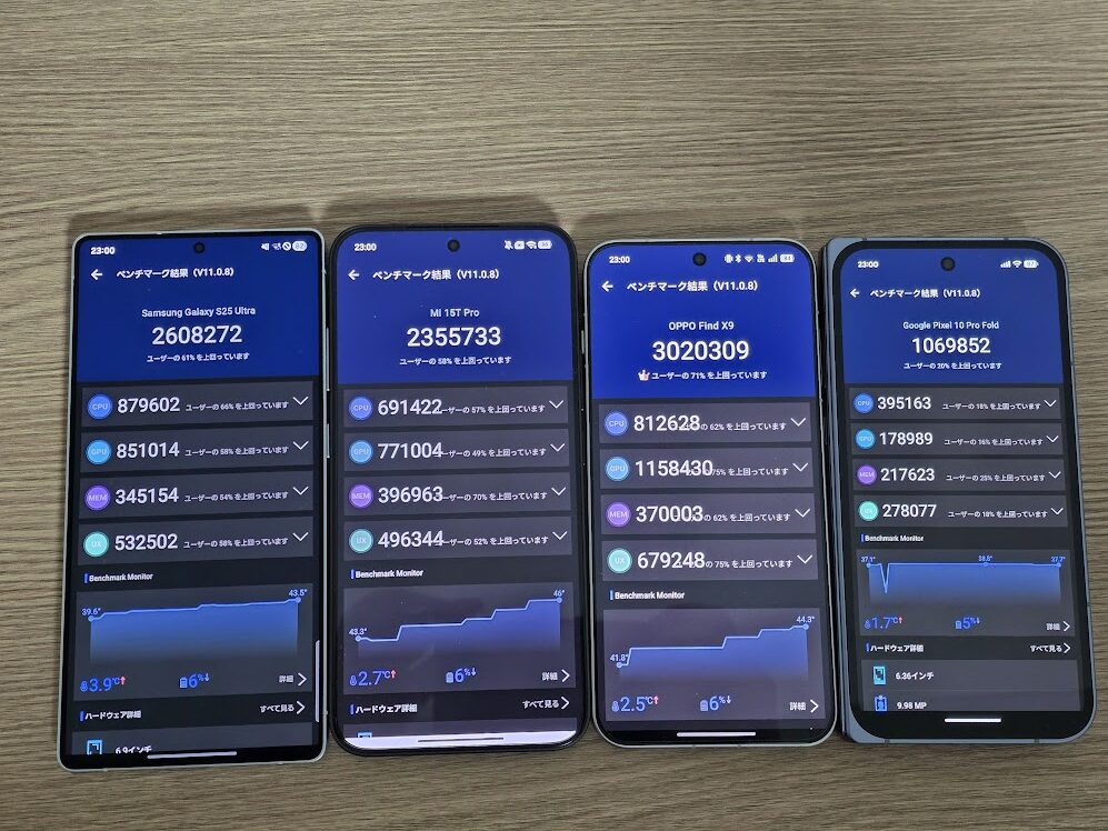 OPPO Find X9 が総合・GPU性能ともに最高値を示し、Galaxy S25 Ultraは安定した高スコア、Mi 15T Pro はバランス型、Pixel 10 Pro Fold は他と比べて大きくベンチマークテストの結果に差がある結果でした。